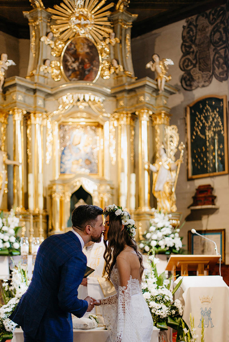 Ten cudowny dzień zaczął się od uśmiechu, który towarzyszył przez cały dzień. Głównie u Panny Młodej Kasi, która zarażała wszystkich wkoło. Nowożeńcy na ceremonię ślubu wybrali drewniany kościółek w rodzinnej miejscowości. Wybrali delikatne zdobienia na krzesłach w kościele, a Kasi bukiet zawierał trawę pampasową i róże. Urocze akcenty monstery dopełniały bukiety na miejscu wesela. Dodatkowo Młodzi zdecydowali się na drewnianą ściankę z makramą, która była stanowiła nie tylko doskonale tło wydarzeń, ale także tło zdjęć rodzinnych.