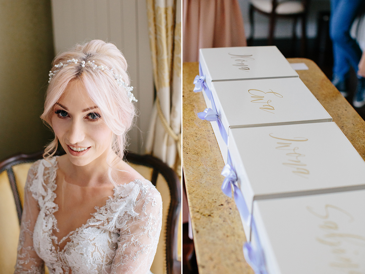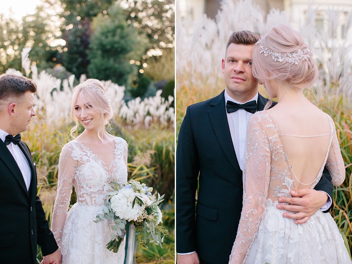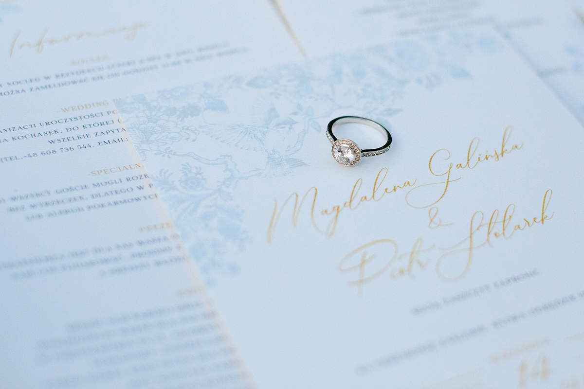 Ponieważ para na codzień mieszka w Holandii wystrój sali oraz papeteria nawiązywały do tego miejsca błękitno-granatowymi barwami oraz elementami grafiki z holenderskiej porcelany. Do tego prawdziwie królewska suknia Magdy, w której wyglądała jak porcelanowa księżniczka migocząca w promieniach wrześniowego słońca i elementy pudrowego różu w makijażu, włosach i sukniach druhen, które przełamywały wszechobecny błękit. Jednak dużo bardziej niż kolory przez całą uroczystość urzekały nas emocje i serdeczność, którymi młoda para obdarowywała siebie i zgromadzonych gości.