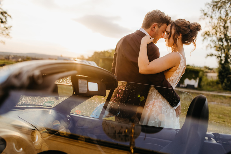 Nie obyło się bez oberwania chmur, jednak tuż przed zachodem i pojawiły się ostatnie promienie. Pogoda próbowała pokrzyżować Wasze plany związane z sesją w dniu ślubu, jednak pokonaliśmy i ją! Udaliśmy się na kilka zdjęć przy perełce Jowity, mowa tu o niebieskim kabriolecie.