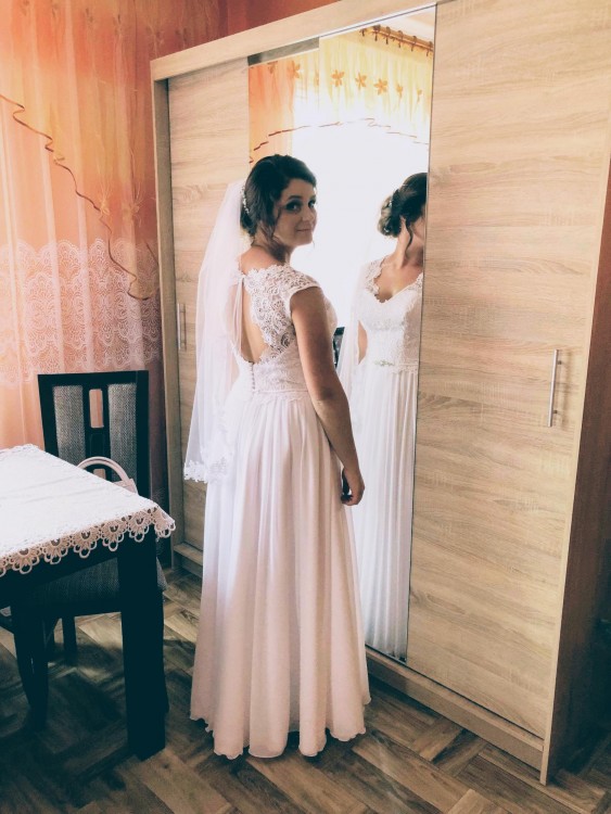 Oferuję na sprzedaż piękną, skromną a zarazem efektowną suknię ślubną AFRODYTA , MODEL BRETANIA, KOLEKCJA 2018! model zwany również 'perfekcyjną romantyczką' :) suknia szyta na 164cm plus obcas okolo 7/8cm, na rozmiar 38/40, góra uszyta z pięknej, porządnej koronki na grubych ramiączkach, dekolt V, zjawiskowo podkreśla biust (miszeczka B/C), efektownie zaprojektowane i uszyte plecy robią wrażenie :) dół sukni uszyty z pięknego muślinu, suknia w tańcu bajkowo faluje co sprawiło, że czułam sie wyjątkowo. Suknia jest lekka i bardzo wygodna ;) przymiarka sukni możliwa w Rzeszowie oraz po wcześniejszym dogadaniu w okolicach Leżajska jak i Buska-Zdroju