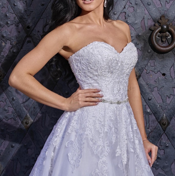 Suknia rozkloszowana, wyszywana koronką i kryształkami. Delikatny srebrny pasek pięknie podkreśla talie.