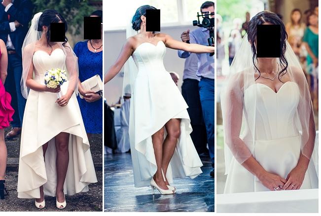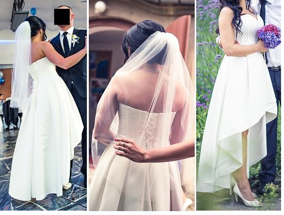 Dzięki temu że suknia jest asymetryczna będzie pasowała także na osobę innym wzroście