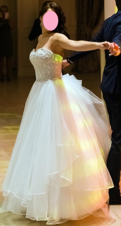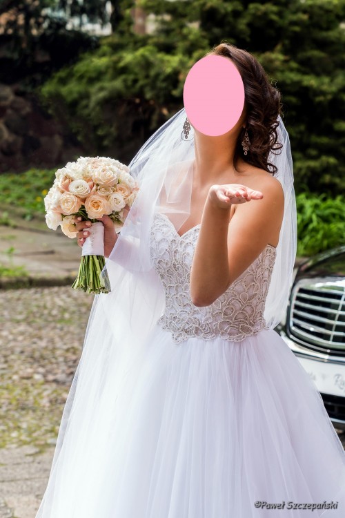 Bez welonu. Suknia założona w maju 2017. Stan idealny. Wyprana. Rozmiar 36. Suknia dla raczej niskiej kobiety. Ja mam 165 i miałam buty na niskim obcasie 6 cm. Suknia lekka i wygodna do tańca. Cena katalogowa w salonie to 6000 zł. Gorąco polecam.