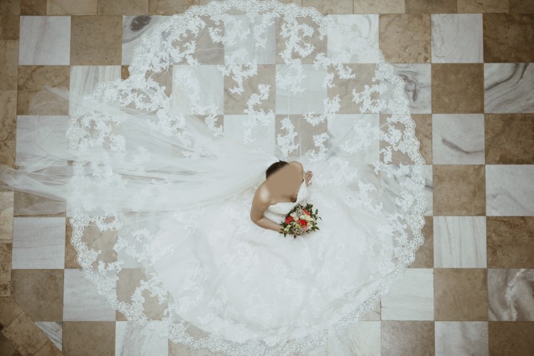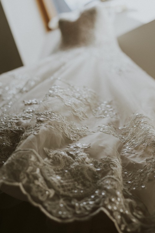 SUKNIA ŚLUBNA W LITERĘ A Z KORONKI DELIKATNIE POŁYSKUJĄCEJ. GORSET W SERDUSZKO. SUKNIA Z TRENEM W KOLORZE IVORY