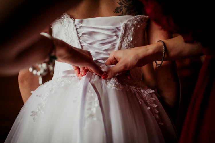 Ma ukryte szlufki, które utrzymują biustonosz pod linią gorsetu, choć nie jest on potrzebny- suknia ma wszyte poduszki.