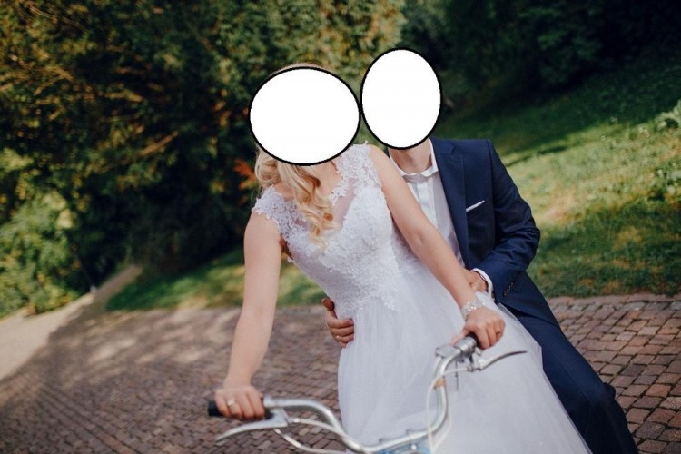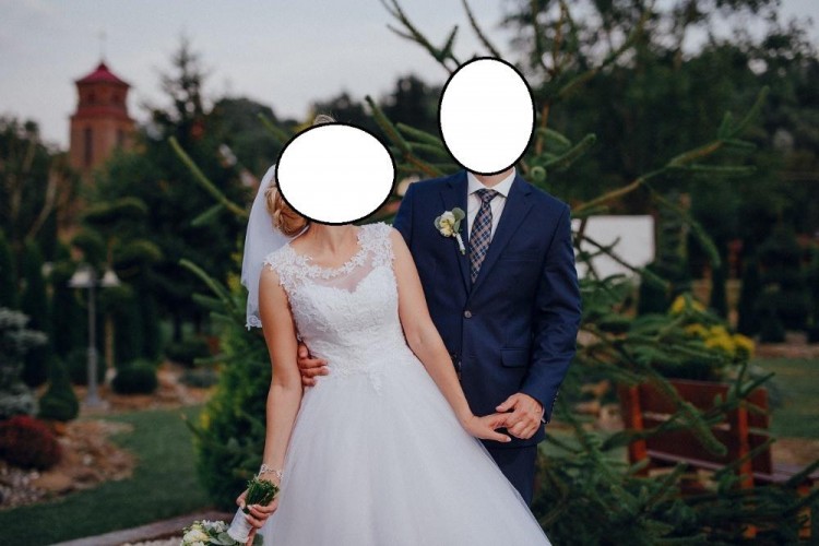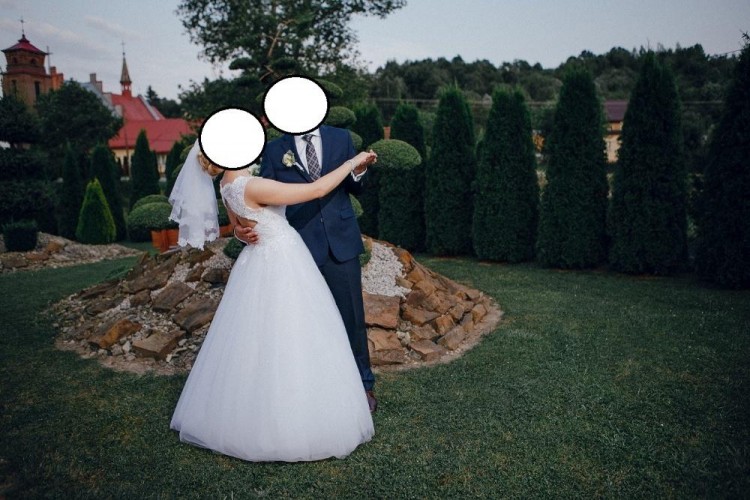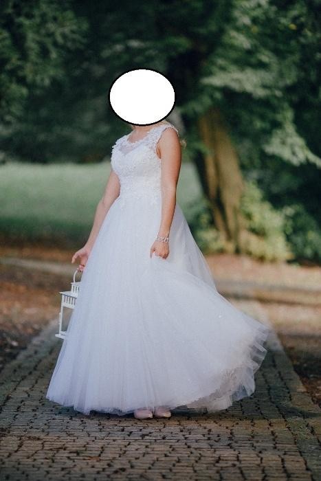 Suknia ślubna w kolorze białym. Góra gorsetowa z wycięciem na plecach wykończona wiązaniem schowanym w spódnice sukienki. Góra wykonana z delikatnie zdobionej koronki z listkami schodzącymi na spódnicę. Wszyte poduszki push'up (z możliwością zmniejszenia lub całkowitego usunięcia). Dół sukni składa się z podszewki i 6 warstw wysokiej jakości tiulu, dodatkowo jeden z nich jest brokatowy co nadaje sukni subtelny blask. Suknia szyta na miarę co daje spore możliwości modyfikacji. Długość 165 + 6 cm obcas