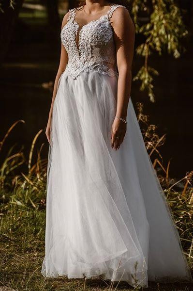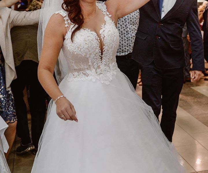 Zjawiskowa suknia ślubna marki Lorange z kolekcji 2018 zakupiona w Salonie Ślubnym Bianka za 3550 zł razem z halką-kołem ( dowód zakupu do wglądu). Suknia śnieżnobiała w rozmiarze 40 ( L ) uszyta na wzrost 170 cm plus 6 cm obcas. Założona jedynie dwa razy: na ślub i sesję; po czym oddana do pralni, gdzie została profesjonalnie wyczyszczona oraz wyprasowana (paragon z pralni również posiadam). Model ten doskonale podkreśla biust oraz eksponuje talię. Gorset ręcznie wyszywany (koronka), bogato zdobiony motywem roślinnym 3D. Ma on wszyte miseczki na biust, jednakże ja dodatkowo miałam ubrany stanik w rozmiarze 75F. Szczegółowe wymiary : biust 103 cm, talia 80 cm, szerokość sukni od pachy do pachy mierzona na płasko: 76 cm. Siateczka na dekolcie w kolorze cielistym dopasowuje się do ciała, dzięki czemu jest niezauważalna. Suknię można bezproblemowo skrócić do niższego wzrostu. Na plecach wiązanie oraz ozdobne guziczki perełki. Suknia układa się w kształt litery A, po dodatkowym założeniu usztywnianego koła to delikatna Princesska. Nie posiada ona żadnych uszkodzeń. Cena wraz z kołem oraz pokrowcem ochronnym. Gratis do zakupu dołączam dwa welony: krótki oraz długi widoczne na zdjęciach. Możliwość przymiarki na Morenie w Gdańsku. Podana kwota do negocjacji. Zapraszam do kontaktu :)