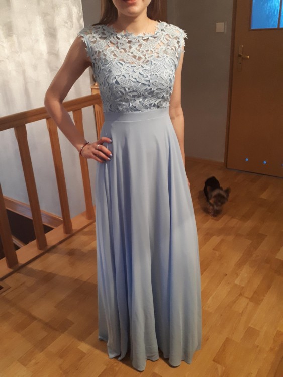 Suknia długa w błękitnym delikatnym kolorze. Piękny lekki zwiewny dół.