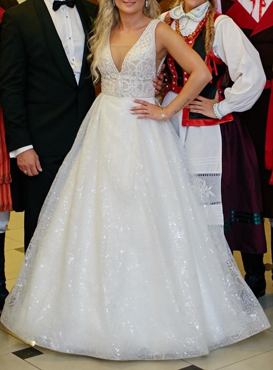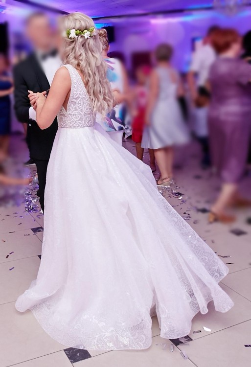 Suknia jest w rozmiarze 36 . Szyta na wzrost 160 + 10 cm obcas. Możliwość regulowania rozmiaru miseczki.