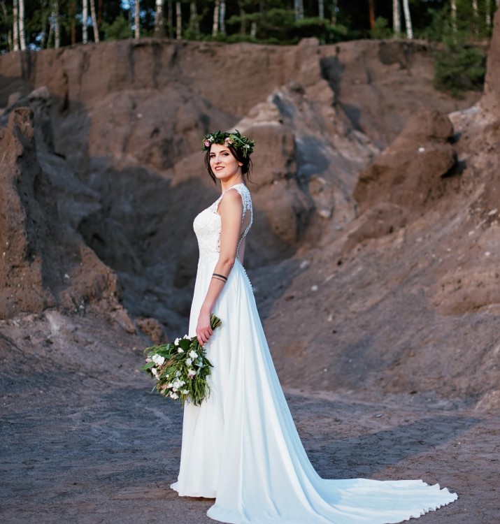 Suknia w kształcie litery A. Posiada jednowarstwowy, lekki tren podpinany na guzik.