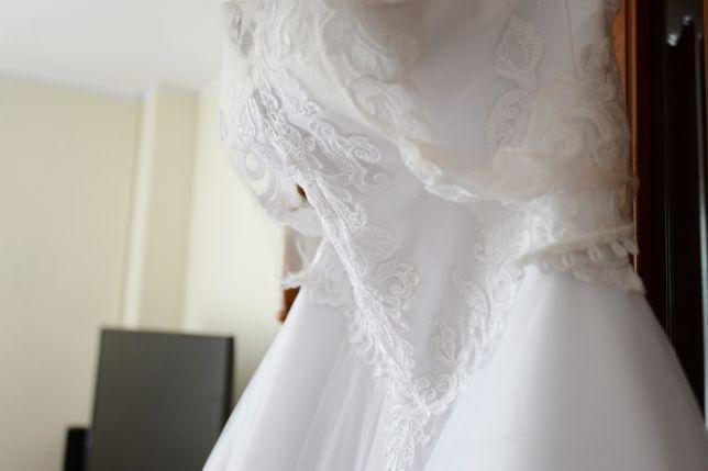 Szyta na rozmiar 34-36 i wzrost 169 + 10 cm obcas. Kolor biel. Kupiona w Salonie Ślubnym "Magdalena" w Elblągu za 5100 zł.