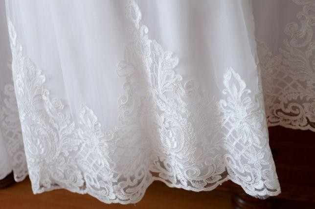 Pięknie zdobiony gorset oraz koronkowy dół sukni. Pod pierwszą warstwą tiulu znajdują się błyszczące drobinki. Wszyte jest koło. Suknia wspaniale się prezentuje. Cena 2000 zł do negocjacji. Oczywiście została wyprana ręcznie w salonie. Zapraszam :)