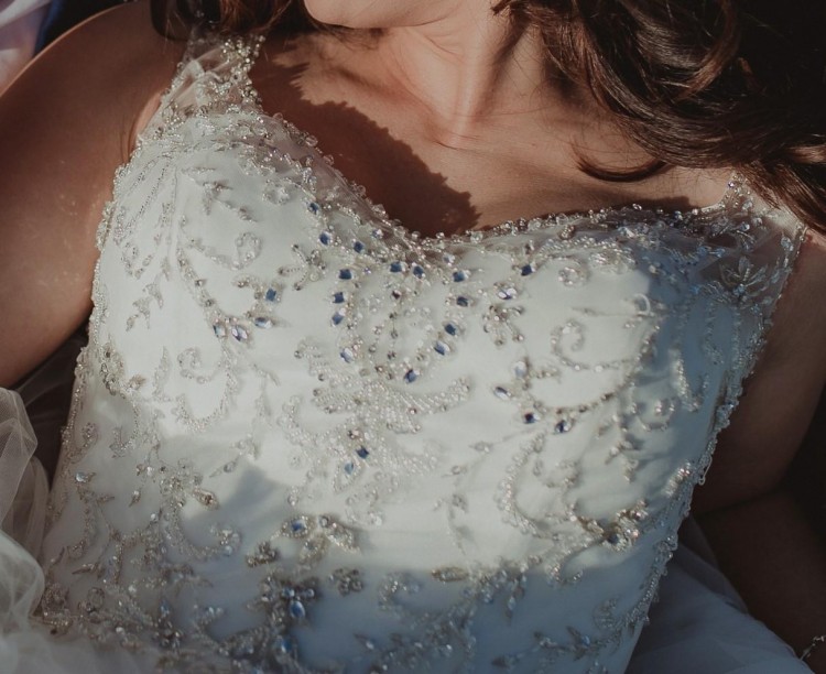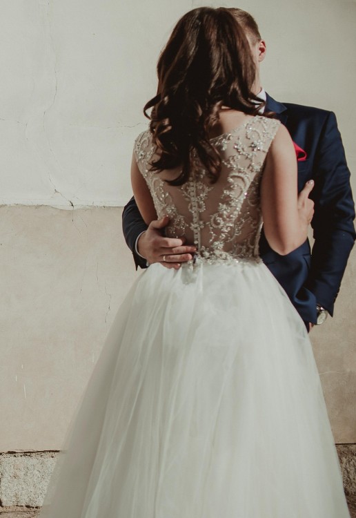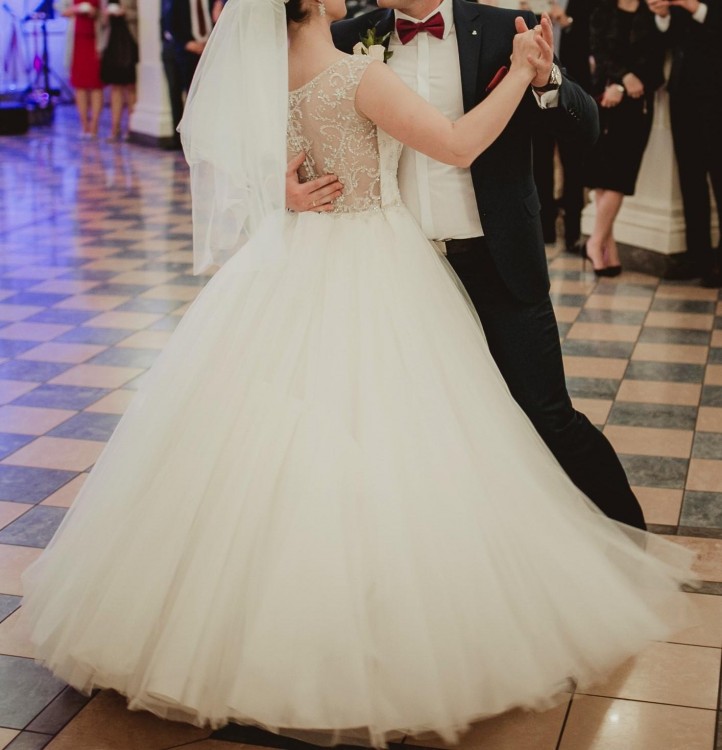 Sprzedam suknie ślubną rozmiar 36,wysokość 165 cm + 10 cm obcas z pięknie zdobionymi kryształkami przodem i tyłem z siateczki.