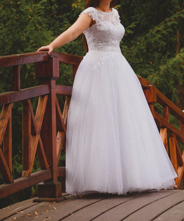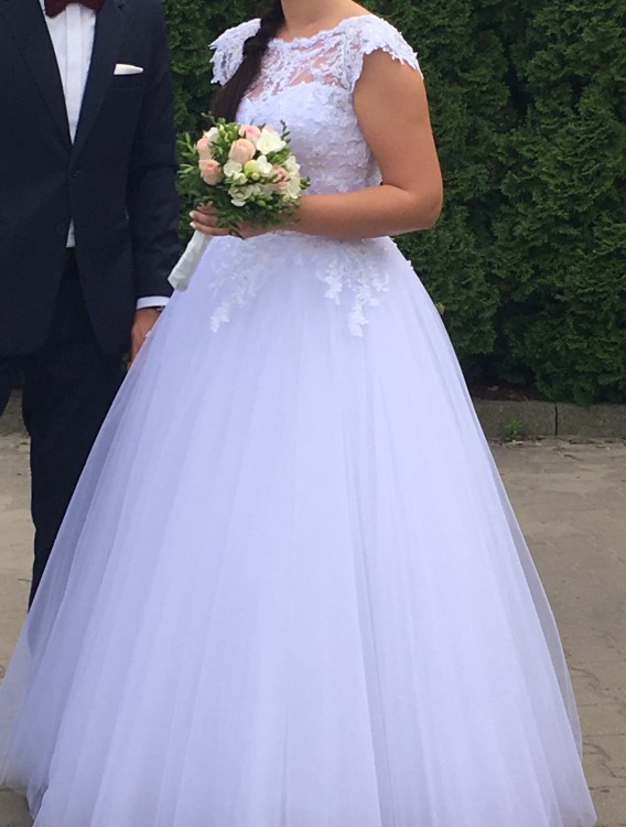 Wymiary na jakie została uszyta to wzrost ok. 170cm, z 5cm obcasem. Możliwe jest skracanie, zwężanie i poszerzanie. Rozmiar ok. 36/38. W cenie oryginalne koło i piękny tren (nieużywany).