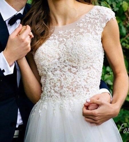 Jest ona lekką, tiulową suknią ślubną z odkrytymi plecami.