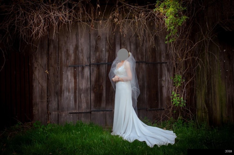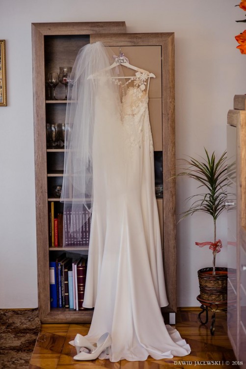 Nie jest jak te wszystkie nie modne już suknie z kołami i z tafty. Ma tylko podszewkę, materiał "lejący", bardzo ładnie się układa na ciele, dzięki czemu jest elegancka i wygodna. Taliowana, dzięki czemu ładnie podkreśla kobiece kształty. Tren jest podpinany na jeden guziczek, dzięki czemu w kilka sekund można się go "pozbyć" po ceremoni. Tren ma też sznureczek od dołu i może być "noszony" jako bransoletka, np. w tańcu - co tworzy ładną, balową stylizację.