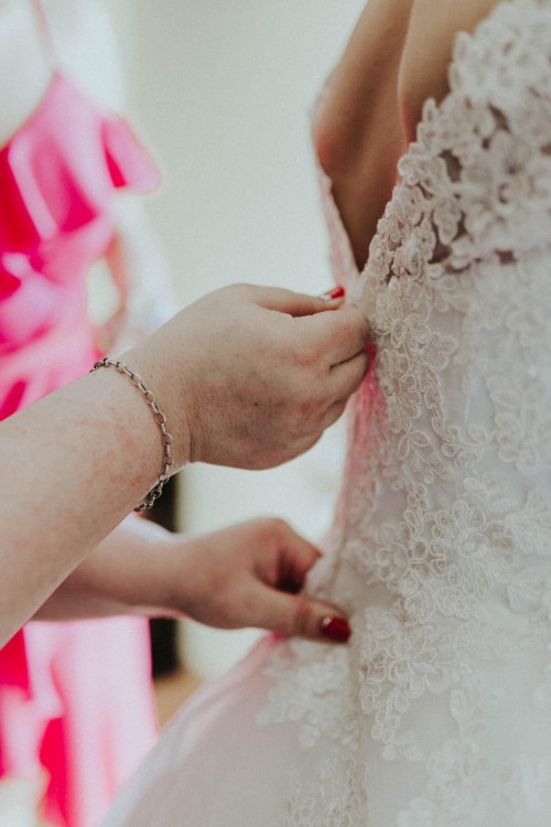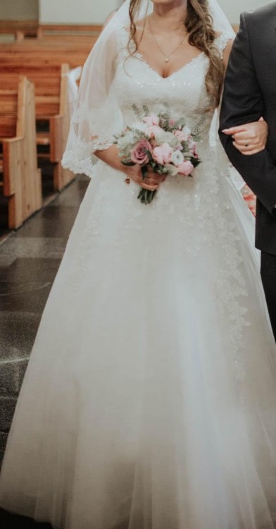 Zjawiskowa, a zarazem delikatna suknia ślubna razem z halką-kołem. Suknia jest w kolorze złamanej bieli w rozmiarze 36/38. Została uszyta na wymiary biust: 95 cm, talia:69 cm, biodra:95 cm, wzrost: 171 cm plus 8 cm obcas. Góra sukienki tworzy wiązany gorset z ręcznie wyszywaną koronką i wbudowanym stanikiem, dzięki któremu jest duża możliwość regulacji. Tył sukienki jest w kształcie litery V, a wiązania gorsetu są zamaskowane dodatkową warstwą materiału, który jest zapinany na suwak. . Założona jedynie w dniu na ślub po czym oddana do pralni. Model ten doskonale podkreśla biust oraz eksponuje talię. Suknię można bezproblemowo skrócić do niższego wzrostu. Na plecach ozdobne guziczki perełki.