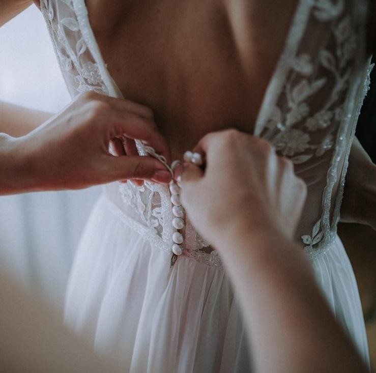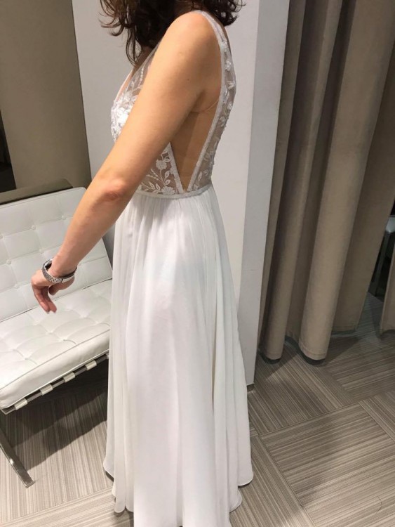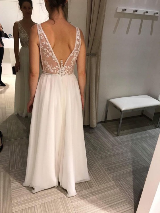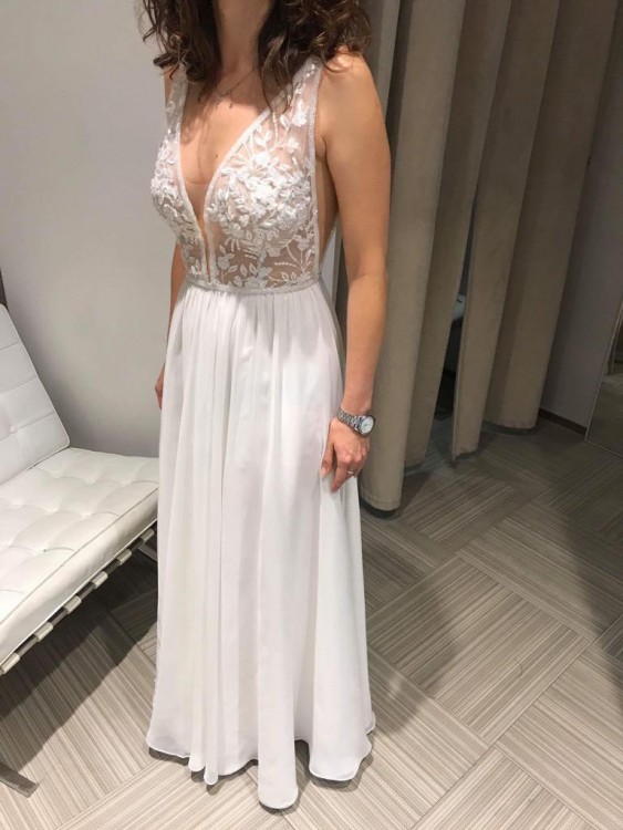 Sprzedam suknię ślubną. Szyta na miarę. Rozmiar 36. Wzrost ok. 172 cm. Założona 2 razy. W bardzo dobrym stanie. Kolor: śmietankowy. Góra wykonana z delikatnej, lekko błyszczącej koronki z wszytymi miseczkami. Z tyłu zapinana na guziczki. Dół sukienki został uszyty z muślinu. Rozporek z prawej strony. Bardzo lekka wygodna. W przypadku pytań zapraszam do kontaktu.