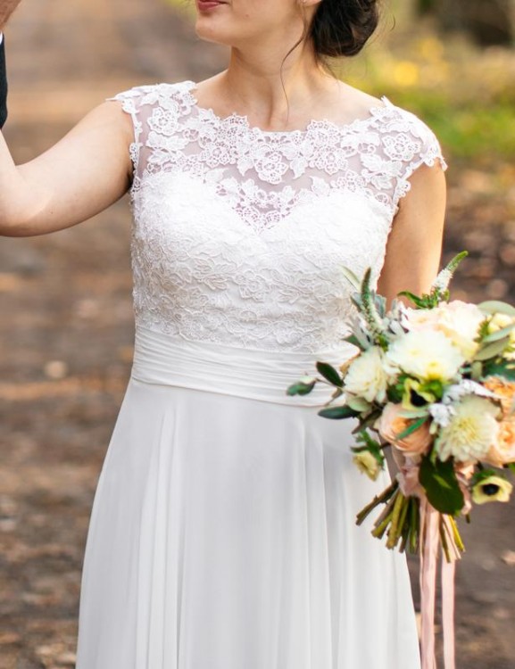 Suknia jest bardzo wygodna, zwiewna, ma wszyte miseczki, można więc nie zakładać biustonosza. Ponadto posiada tren, który podpina się malutkim guziczkiem.