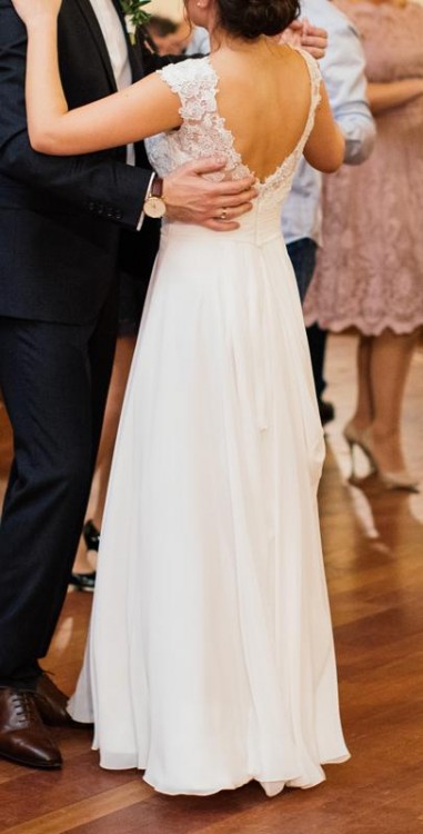 Sukienkę założyłam dwa razy, na ślub oraz na sesję, po czym została wyprana. Stan bardzo dobry. Jestem jej pierwszą właścicielką.