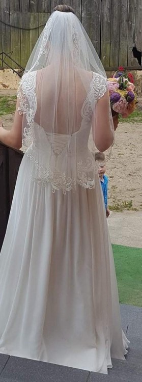 Góra sukni składa się z delikatnej koronki, z przodu dekolt w łódeczkę, natomiast z tyłu odkryte plecy, przepięknie otoczone koronką (idealnie sprawdzają się przy wysokiej temperaturze). Suknia ma wszyty wygodny, sznurowany gorset, dzięki czemu ładnie trzyma postawę a przy tym jest on wygodny, istnieje możliwość dostosowania rozmiaru biustu poprzez wszycie poduszek, dzięki czemu nie trzeba się martwić do dobranie odpowiedniej bielizny.
