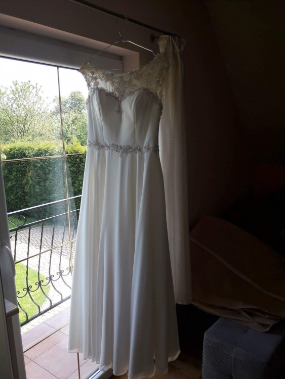 Suknia rozm 38/40, skracana na 167 cm wzrostu+ obcas; idealnie retuszuje kobiece kształty, doskonale układa się w tańcu. Cena Salonowa 4500zl, możliwa negocjacja oraz osobiste przymierzenie sukni na terenie Krakowa. Zapraszam do kontaktu.