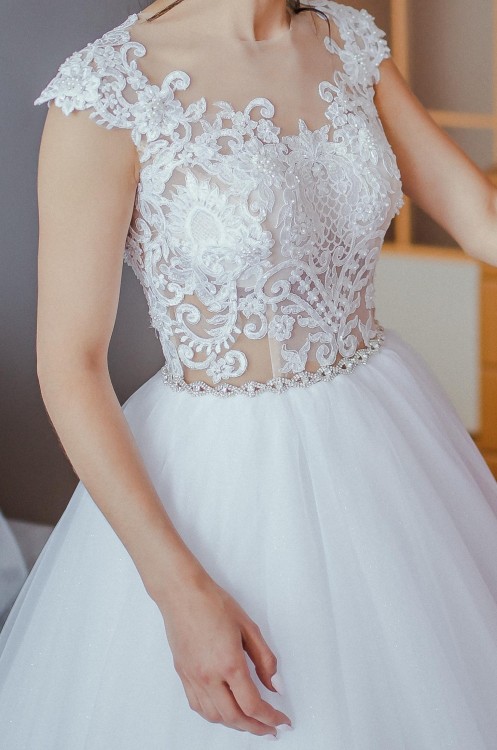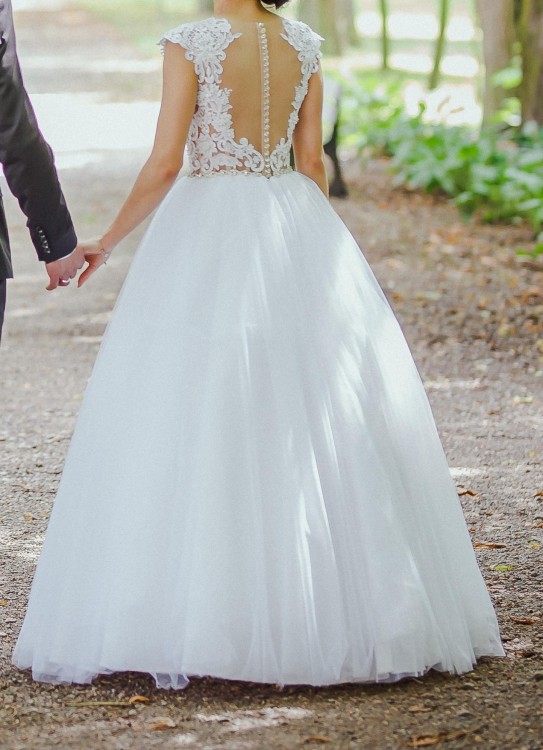 Suknia ślubna z koronkowym gorsetem i aplikacjami. Plecy z ozdobnymi guziczkami. Spódnica tiulowa z brokatem. Stan bardzo dobry.