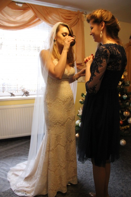 Sukienka została uszyta rozmiar M/L na 176 wysokości +9 cm obcas, więc bez problemu po obcięciu dołu będzie pasowała na niższe panny młode.