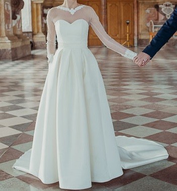 Suknia jest bardzo elegancka, lekka i wygodna, posiada funkcjonalne kieszenie, które podczas wesela zrobiły furorę oraz uroczą kokardę dopinaną z tyłu. Sukienka zapinana na zamek idealnie dopasowuje się do sylwetki, bardzo dobrze się trzyma i nie przekręca. Dekolt w serduszko. Do sukni dopinany jest tren, który można podpiąć na niewidoczny guziczek lub w razie konieczności całkowicie odpiąć.