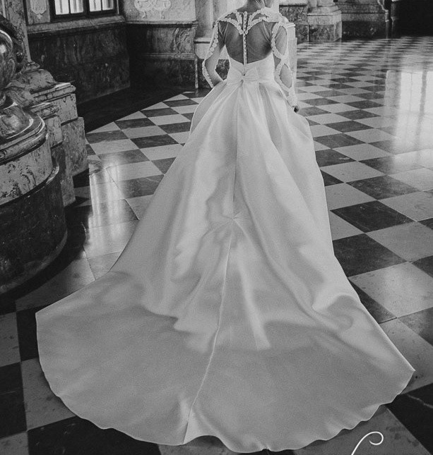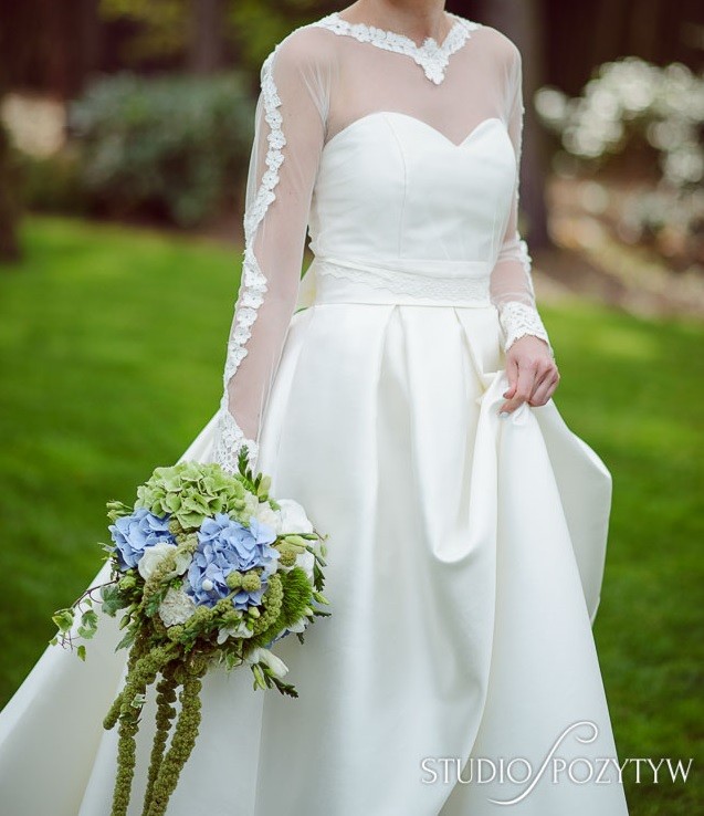 Suknia została zakupiona w salonie sukien ślubnych w Krakowie (koszt sukni – 2980 zł i trenu – 370 zł). Do sukni mogę dodać koronkowe bolerko na długi rękaw zapinane z tyłu na biżuteryjne guziki, które kosztowało 290 zł. Założona była 2 razy (ślub + sesja) i oczywiście została wyczyszczona ;-)