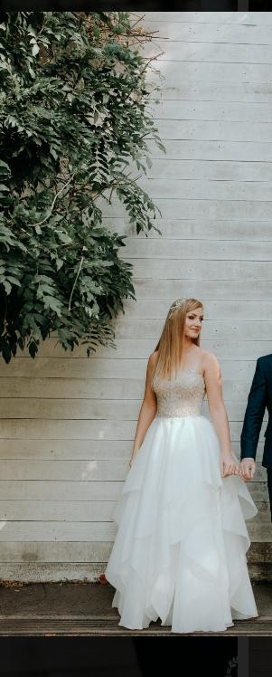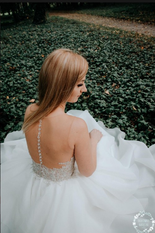 ZALETY: Suknia jest niesamowicie lekka świetnie wygląda podczas tańca. Nic nie uwiera oraz się nie gniecie. W przeciwieństwie do sukienek z tiulem nie ma ryzyka uszkodzenia ( porwania).Góra pięknie się mieni co idealnie współgra z delikatną organzą. Podkreśla talię oraz idealnie opada na biodrach. Suknię bez problemu można skrócić.
