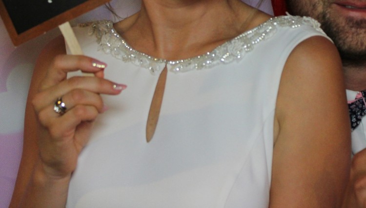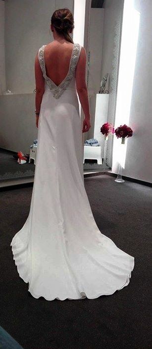 Z tyłu są głęboko wycięte plecy, ozdobione ręcznie wyszywanym sakarem, mieniącym się pod każdym kątem. Przód sukni – obramówka również ozdobiona sakarem, łezka pogłębiona. Suknia posiada również tren, podpinany na specjalny niewidoczny guzik. Do sukni dołączam również szal prześwitujący w kolorze ivory, do wykorzystania w przypadku złej pogody. Suknia wyczyszczona w profesjonalnej pralni, stan idealny. Wywołała niemałe poruszenie, goście byli nią zachwyceni- skromna i klasyczna. Czysta elegancja- naprawdę robi wrażenie.