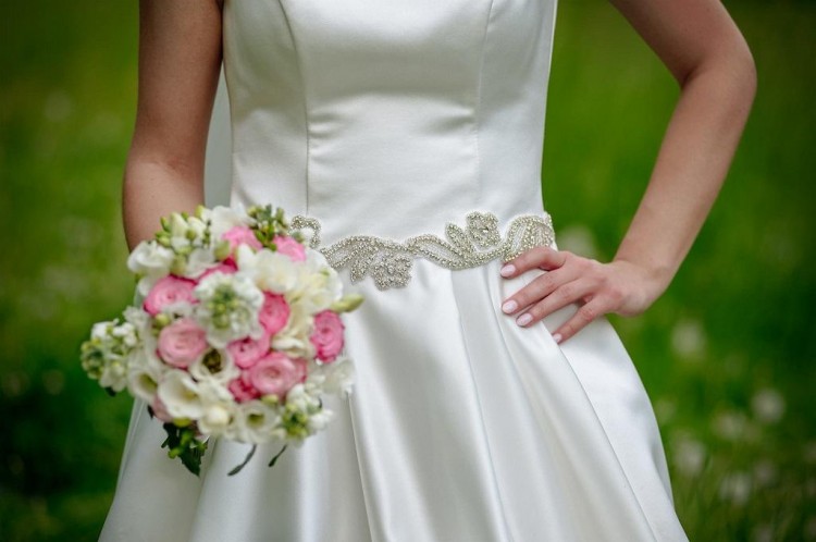 Suknia wykonana jest w całości z atłasu, dlatego przypadnie do gustu miłośniczkom klasycznej elegancji. W pasie posiada przyszyty ozdobny pas z kryształków, który ładnie kryje łączenie górnej części sukni ze spódnicą, a dodatkowo sprawia, że suknia nie wydaje się nudna. Kryształki pięknie mienią się w świetle, po czyszczeniu wszystkie są na swoim miejscu, nie ma żadnych ubytków.