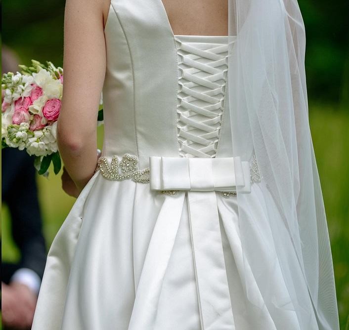 Górna część sukni posiada wiązanie gorsetowe, które zwiększa zakres możliwości dopasowania sukni do sylwetki, co jest dużym plusem przy przedślubnych wahaniach wagi. Pod wiązaniem wszyty został na moją prośbę materiał (w oryginalnym projekcie było samo wiązanie), ale myślę, że istnieje możliwość odprucia go bez szkody dla sukni i uzyskania w ten sposób głębszego wycięcia na plecach. Materiał jest miły w dotyku i pięknie się układa, a dodatkowo wygląda szlachetnie na żywo i na zdjęciach.