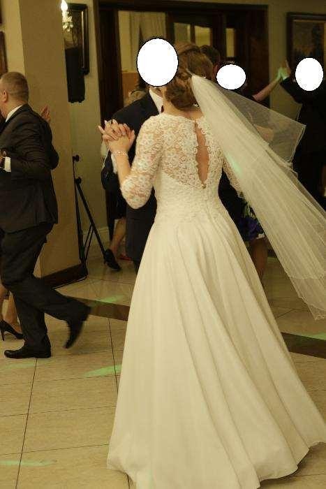 Przepiękna i elegancka suknia: gipiura, łezka na plecach, na niedużym kole, wszyte miseczki(C lub D), złamana biel (kolor perłowy)