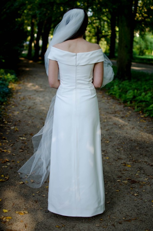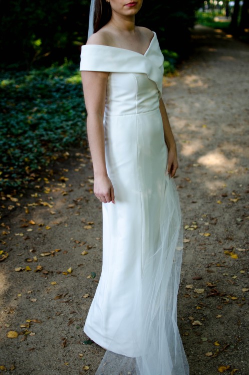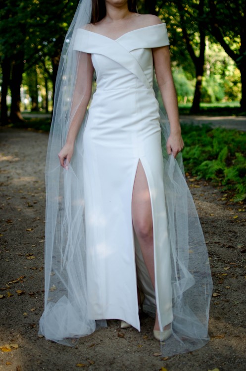 Elegancka suknia ślubna w rozmiarze 36-38 była szyta na miarę. Projekt przystosowany jest dla budowy ciała "gruszka", kiedy to biodra są lekko szersze niż ramiona. Ozdobny, przykuwający uwagę, dekolt i podkreślone ramiona nadają równowagi budowie ciała. Szalenie modne rozcięcie na nogę dodaje seksapilu i wyrazistości całemu projektowi.