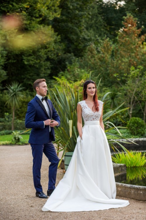 Spódnica z kieszeniami wykonana z mikado z kontrafałdami (ten materiał nie gniecie się tak jak satyna, dzięki czemu wygląda zjawiskowo podczas całego wesela) z koronkową górą na podwójnej siateczce w kolorze skóry. Suknia w kolorze ivory / śmietankowym uszyta " w jednym kawałku", ale w taki sposób, aby wyglądać jak dwuczęściowa (obszerna spódnica + top / body). Połączenie dwóch części było celowe, ze względu na obsługę sukni podczas wesela ;) Spódnica zapinana na zamek, góra z koronki - na guziczki.