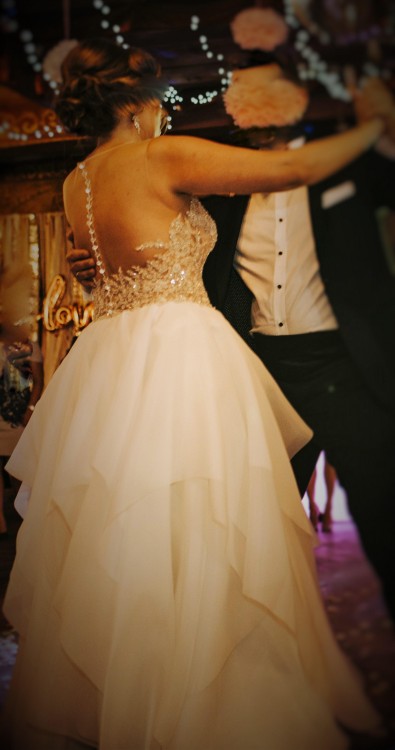 Koronka umieszczona na delikatnej, transparentnej siateczce przybiera kształt wijących się po plecach i dekolcie kwiatowych motywów. Z tyłu zapinana na delikatne kryształowe guziczki. Suknia wykonana jest z wielu warstw ciętej laserowo jedwabnej organzy w kolorze śmietankowym. Cudownie wygląda w tańcu.