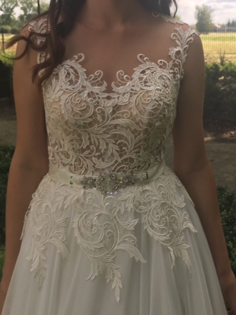 Stan sukni oceniam na dobry, ale została lekko uszkodzona w miejscu podpięcia trenu. Nie oddałam jej do "naprawy" z tego względu,że przyszła panna młoda i tak będzie potrzebowała poprawek krawieckich więc może ja poprawić na swój wymiar.