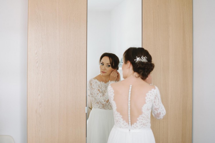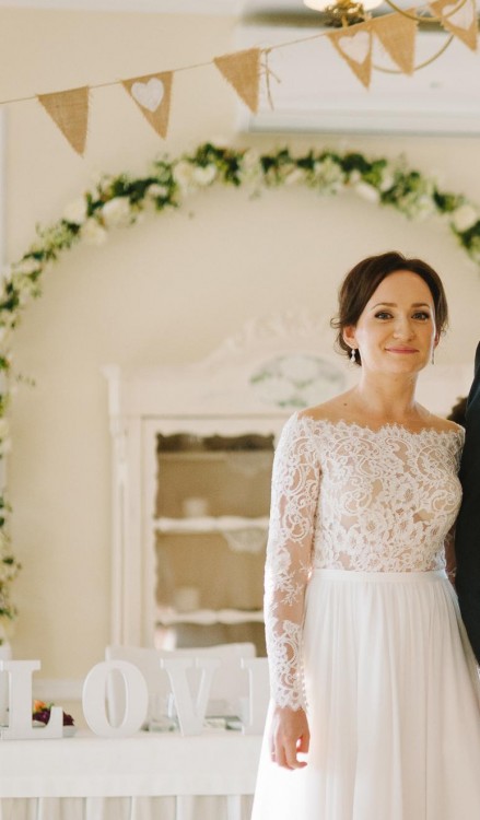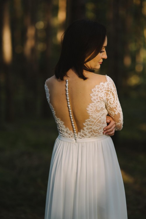 Suknia w rozmiarze 36, na osobę o wzroście ok. 162 cm plus 8 cm obcas. Suknia posiada efektowne rozcięcie na nodze, piękny tył zapinany na guziczki. Suknia bardzo lekka, zwiewna, pięknie układa się w tańcu. Stan sukni jest idealny, nie jest zniszczona, koronka nigdzie się nie popruła.