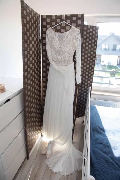 Uszyta na wzrost 166 plus niski obcas. Suknia posiada tren. Dodatkowo zmienione krysztalowe guziczki. Serdecznie zapraszam do kontaktu. 511253468