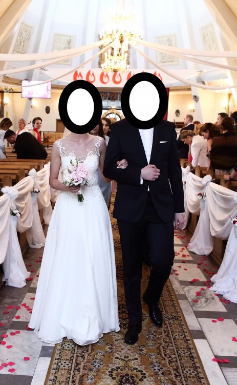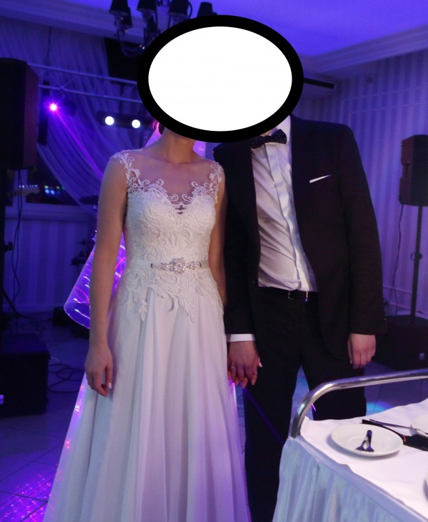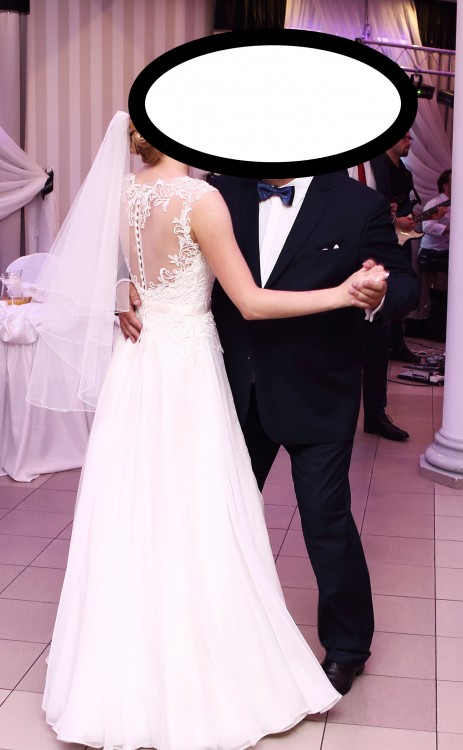 Góra sukni wykonana jest z gipiury naszytej na cielisty tiul, którego w ogóle nie widać. Plecy, wycięte w kształcie serca, oczarowały gości. W talii jest delikatny, śmietankowy paseczek, ozdobiony kryształkami.