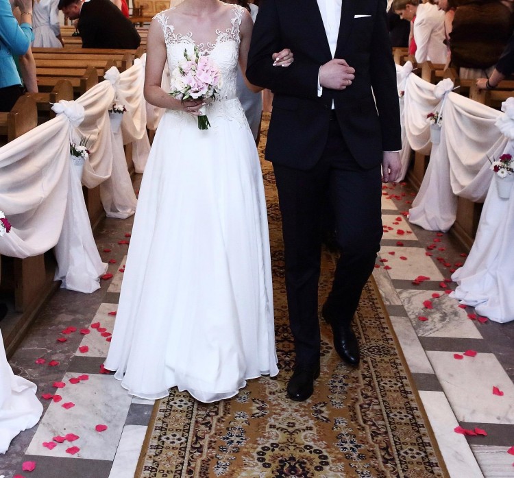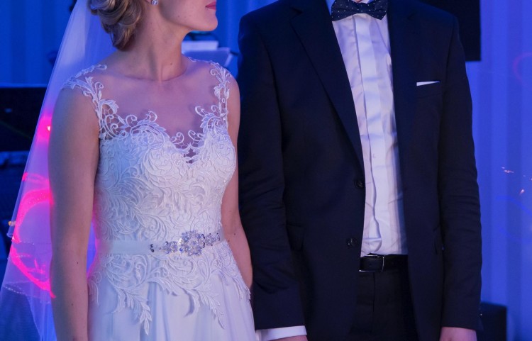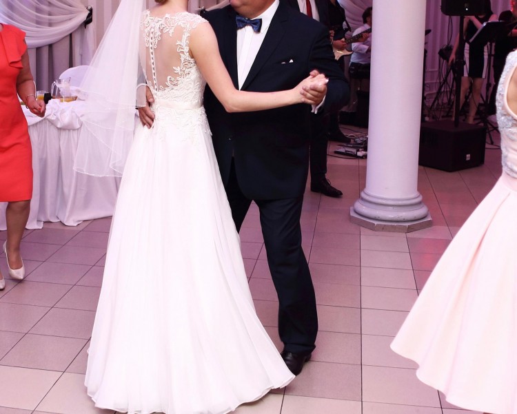 Góra sukni wykonana jest z gipiury naszytej na cielisty tiul, którego w ogóle nie widać. Plecy, wycięte w kształcie serca, oczarowały gości. W talii jest delikatny, śmietankowy paseczek, ozdobiony kryształkami.