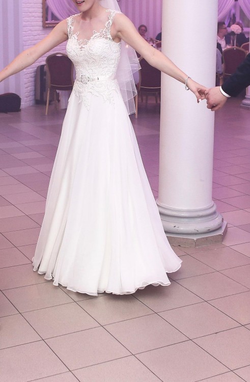 Na moją prośbę wprowadzono zmianę - dół jest od sukni Gala Keira - z muślinu, bez wielu warstw tiulu, które tylko poszerzałyby sylwetkę. Dzięki tej zmianie, suknia jest lekka, bardzo wygodna, pięknie układa się w tańcu, a do tego sylwetka wygląda w niej niezwykle delikatnie i zgrabnie. A co najważniejsze, suknia jest oryginalna i jedyna w swoim rodzaju:)