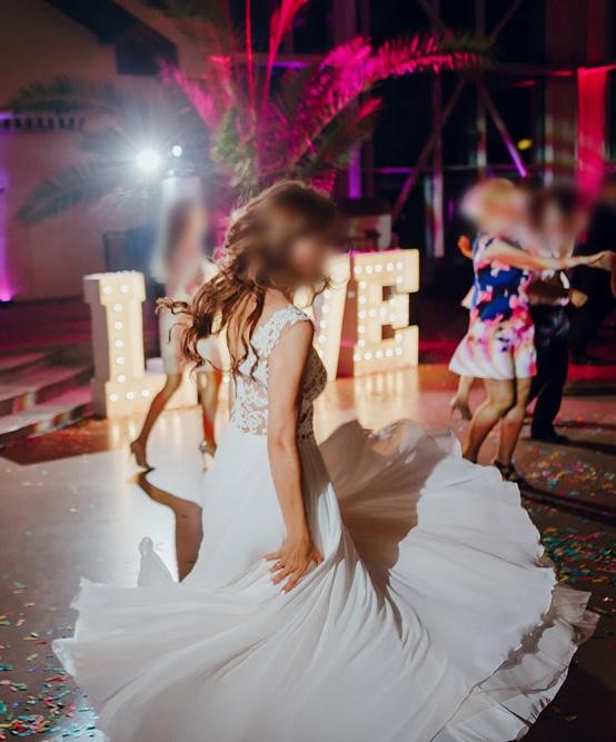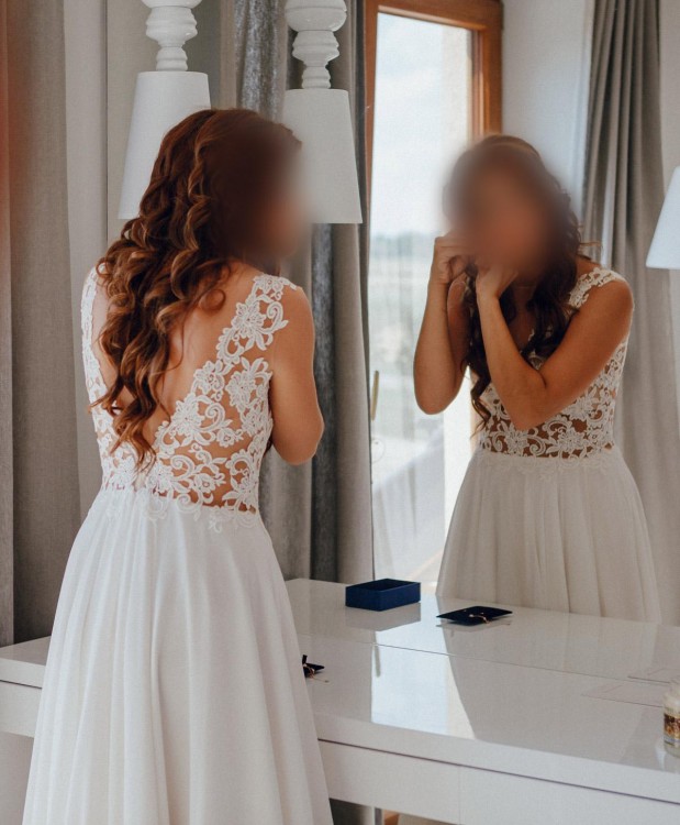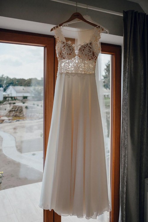 Góra sukni jest z białej koronki na cielistym materiale, z dekoltem na plecach. Dół sukni ma kolor złamanej bieli, a jedna z warstw ma podbicie z materiału w kolorze szampańskim. Cały dół sukni jest niesamowicie lekki, przepięknie się skręca podczas tańca. Suknia jest bardzo wygodna oraz lekka, wcale się nie gniecie, nie krępuje ruchów.