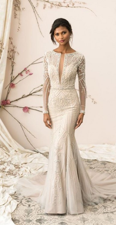 Suknia o dopasowanym kroju, dekolt w linii V. Długi rękaw zdobią specjalnie zaprojektowane kryształowe ornamenty, harmonijnie rozbudowane na całej sukni i w całości haftowane ręcznie. Oprószony kryształami na szyi, tasiemkowy dekolt, pasuje do iluzji z tyłu sukni, ozdobionej koralikami i guzikami. Pokryta innowacyjną siatką Stretch, elastycznie dopasowuje się do każdej pozycji ciała.