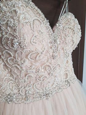 Góra sukni dzięki unikatowej technologii SuperFit świetnie utrzymuje się na linii biustu i talii. Jest ręcznie ozdobiona ornamentami z kryształków, perełek i dżetów, sprawiając efekt delikatnej koronkę. Lekkości sukni nadaje dość duża objętości tiulowej spódnicy. Tren widoczny na zdjęciach może być podpięty .