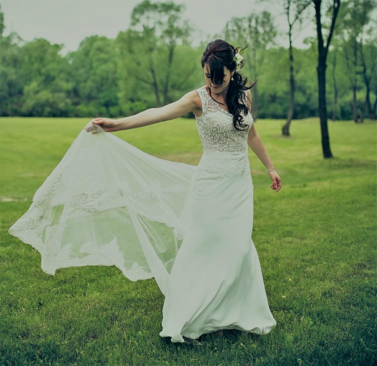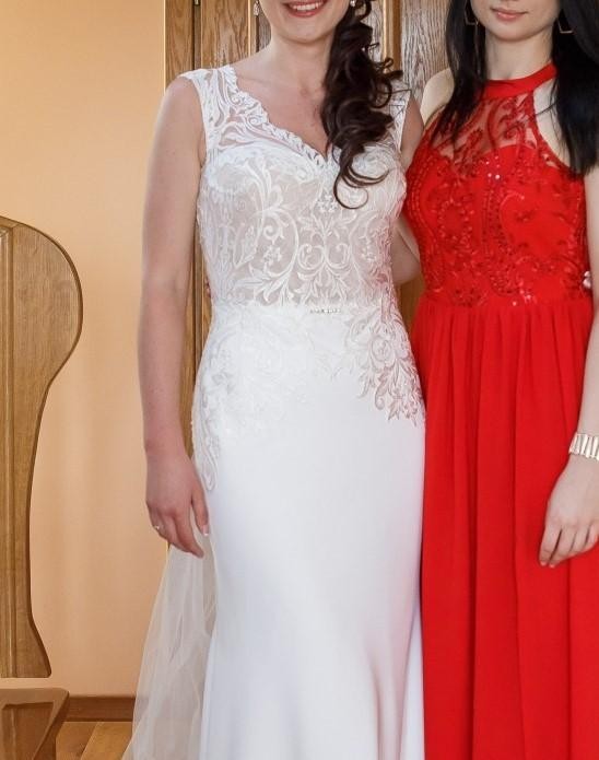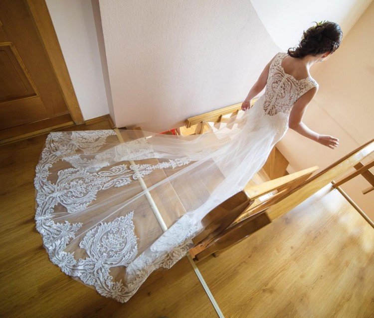 Pięknie eksponuje plecy, koronkowy podpinany tren, który elegancko układa się, nie przeszkadzając w tańcu (zwłaszcza w obrotach).