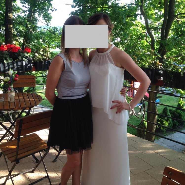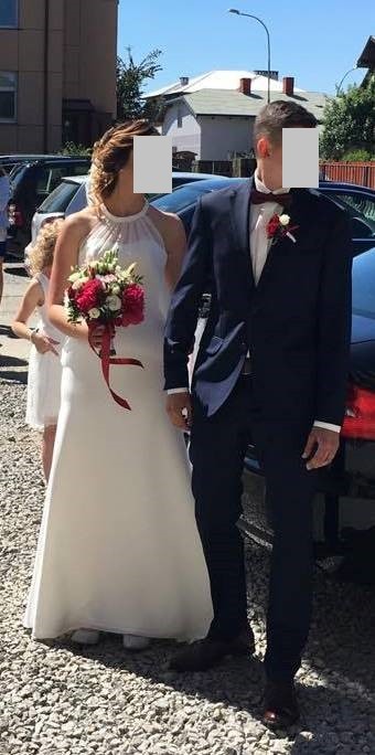 Suknia jest elegancka, klasyczna i lekka. Górę sukienki można zdjąć. Kamienie na sukience są od Swarovskiego. Zapięcie na zamek oraz guziki. Dekolt w kształcie serca.