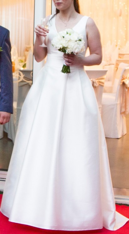 Suknia (czerwiec 2016) szyta na miarę; rozmiar 38/40, na wzrost 175 cm (obcas 2 cm), materiał Mikado, kolor- śmietana, z tyłu dłuższa co dodaje jej elegancji.